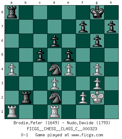Last move : 0-1 2025 January 15 15:55:5 [Event "FICGS__CHESS__CLASS_C__000323"] [Site "FICGS"] [Date "2024.08.24"] [Round "1"] [White "Brodie,Peter"] [Black "Nudo,Davide"] [Result "0-1"] [WhiteElo "1649"] [BlackElo "1793"] 1.e4 c5 2.c4 Nc6 3.Nc3 g6 4.Nf3 Bg7 5.Be2 d6 6.O-O Bg4 7.h3 Bxf3 8.Bxf3 e6 9.d3 a6 10.Be3 Nge7 11.Qd2 O-O 12.Bh6 Bxh6 13.Qxh6 Nd4 14.Bd1 b5 15.cxb5 axb5 16.Qd2 Nec6 17.Nxb5 Nxb5 18.Bc2 Nbd4 19.Bb3 Qh4 20.Bd1 e5 21.Bg4 Rfb8 22.g3 Qxg4 23.hxg4 Nf3+ 24.Kg2 Nxd2 25.Rfd1 Rxb2 26.a4 Nd4 0-1 Follow this game move after move (download)The game of chess is the touchstone of the intellect. (Goethe) Man kann eine Schachpartie nur gewinnen, wenn das Gleichgewicht gestört ist. In einer Stellung mit ungestörtem Gleichgewicht ist auch das größte Genie hilflos - in der Stellung steckt dann eben kein genialer Einfall. (Wilhelm Steinitz) Realmente no sabemos como el juego fue inventado, aunque hay sospechas. Tan pronto como descubramos a los culpables, se los haremos saber. (Bruce Pandolfini) Avec des compensations pour le matériel en plus... (Anonyme) Control your own destiny or someone else will. (Jack Welch)