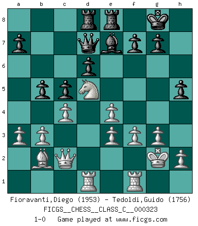 Last move : 1-0 2025 April 1 14:11:33 [Event "FICGS__CHESS__CLASS_C__000323"] [Site "FICGS"] [Date "2024.08.24"] [Round "1"] [White "Fioravanti,Diego"] [Black "Tedoldi,Guido"] [Result "1-0"] [WhiteElo "1953"] [BlackElo "1756"] 1.Nf3 d6 2.g3 c5 3.Bg2 e5 4.d3 h6 5.O-O Nf6 6.c4 Nc6 7.Nc3 Be6 8.a3 Be7 9.Ne1 Rb8 10.Nc2 Qd7 11.Ne3 Nd4 12.Ned5 e4 13.dxe4 O-O 14.e3 Nc6 15.b3 Ne5 16.Bb2 Rfe8 17.Qc2 Bh3 18.f3 Bxg2 19.Kxg2 Nxd5 20.Nxd5 h5 21.Rad1 b5 22.Bxe5 Rbd8 23.Bb2 1-0 This chess game has been lost on time (started : 2024.08.24 9:26:30) Follow this game move after move (download)I look one move ahead... the best ! (Siegbert Tarrasch) Lisa Lane, amerikanische Schachmeisterin, hatte Fischer einmal als stärksten lebenden Spieler bezeichnet. Antwort: Das ist richtig, aber Lisa Lane ist eigentlich nicht in der Lage, das zu beurteilen. (Robert James Fischer) Las ideas audaces son como las piezas del Ajedrez que avanzan hacia adelante. Ellas pueden ser vencidas, pero también pueden iniciar una partida victoriosa. (Goethe) Aidez vos pièces, elles vous aideront. (Paul Morphy) Whenever people agree with me, I always feel I must be wrong. (Oscar Wilde)