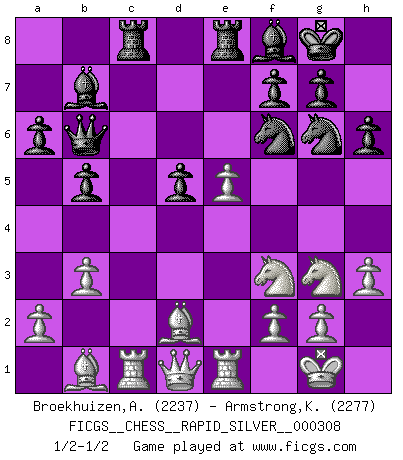 Last move : 1/2-1/2 2024 November 10 4:39:36 [Event "FICGS__CHESS__RAPID_SILVER__000308"] [Site "FICGS"] [Date "2024.08.27"] [Round "1"] [White "Broekhuizen,A. T. S."] [Black "Armstrong,Keith"] [Result "1/2-1/2"] [WhiteElo "2237"] [BlackElo "2277"] 1.e4 e5 2.Nf3 Nc6 3.Bb5 a6 4.Ba4 Nf6 5.O-O Be7 6.d3 b5 7.Bb3 d6 8.c3 O-O 9.h3 Bb7 10.Nbd2 Na5 11.Bc2 c5 12.Re1 Re8 13.Nf1 h6 14.Ng3 Bf8 15.d4 exd4 16.cxd4 cxd4 17.Nxd4 Qc7 18.Bf4 Nc4 19.b3 Ne5 20.Rc1 Ng6 21.Bd2 Qb6 22.Nf3 Rac8 23.Bb1 d5 24.e5 1/2-1/2 Follow this game move after move (download)There's never before been a Chess player with such a thorough knowledge of the intricacies of the game and such an absolutely indomitable will to win. I think Bobby is the greatest player that ever lived. (Lisa Lane) Herr Iljumschinow ist ein etwas merkwürdiger Geschäftsmann: Er arbeitet zusammen mit Leuten wie Muammar al-Gaddafi; früher ist das Saddam Hussein gewesen. (Joel Lautier) Uno no tiene que jugar muy bien, es suficiente jugar mejor que el oponente. (Siegbert Tarrasch) Un footballeur joue avec ses pieds, parfois avec sa tête. Un joueur d'échecs ne joue qu'avec sa tête. Et quand il ne joue plus, il meurt. (Jacob Murray) Thus, what is of supreme importance in war is to attack the enemy's strategy. (Sun Tzu)