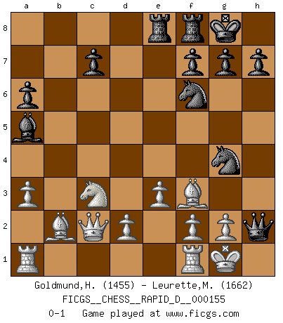 Last move : 0-1 2024 September 30 13:23:55 [Event "FICGS__CHESS__RAPID_D__000155"] [Site "FICGS"] [Date "2024.08.27"] [Round "1"] [White "Goldmund,Heike"] [Black "Leurette,Marc-Antoine"] [Result "0-1"] [WhiteElo "1455"] [BlackElo "1662"] 1.b4 e5 2.Bb2 Bxb4 3.Bxe5 Nf6 4.a3 Ba5 5.c4 Nc6 6.Bb2 O-O 7.e3 d5 8.cxd5 Qxd5 9.Nf3 Bg4 10.Be2 Rae8 11.O-O Bxf3 12.Bxf3 Qd6 13.Nc3 a6 14.Qc2 Ne5 15.Bxb7 Neg4 16.Bf3 Qxh2+ 0-1 Follow this game move after move (download)If your opponent offers you a draw, try to work out why he thinks he's worse off. (Nigel Short) Das Zentrum ist der Balkan des Schachbretts - Kriegshandlungen können in jedem Moment ausbrechen. (Aaron Nimzowitsch) El Ajedrez es un expediente tonto que hace creer a la gente inactiva que hacen una cosa muy astuta cuando solamente estan perdiendo su tiempo. (George Bernard Shaw) On entre au jeu d'Echecs comme on entre en Religion. Pour le joueur d'Echecs, la partie d'Echecs c'est l'office, la messe, le défilé du 1er Mai, le dépôt de gerbe au Monument aux Morts. C'est un drame sacré. (Michel Roos) Don't be irreplaceable, if you can't be replaced, you can't be promoted. (Dan Rotaru)
