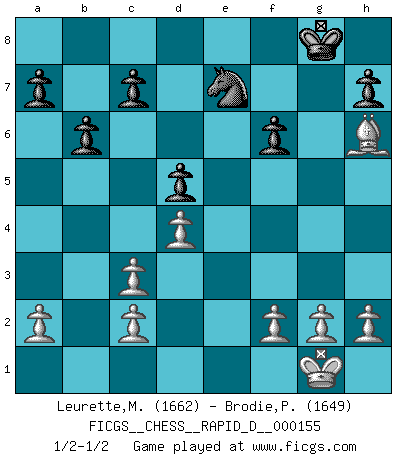 Last move : 1/2-1/2 2024 October 16 9:24:14 [Event "FICGS__CHESS__RAPID_D__000155"] [Site "FICGS"] [Date "2024.08.27"] [Round "1"] [White "Leurette,Marc-Antoine"] [Black "Brodie,Peter"] [Result "1/2-1/2"] [WhiteElo "1662"] [BlackElo "1649"] 1.e4 e6 2.d4 d5 3.Nc3 Bb4 4.e5 Bxc3+ 5.bxc3 Ne7 6.Bd3 O-O 7.Nf3 Nf5 8.Bxf5 exf5 9.O-O Be6 10.Bg5 f6 11.exf6 gxf6 12.Bh6 Rf7 13.Nh4 Nc6 14.Re1 Qd7 15.Rb1 b6 16.Qd3 Re8 17.Nxf5 Bxf5 18.Rxe8+ Qxe8 19.Qxf5 Qd7 20.Qxd7 Rxd7 21.Re1 Re7 22.Rxe7 Nxe7 1/2-1/2 Follow this game move after move (download)The passed Pawn is a criminal, who should be kept under lock and key. Mild measures, such as police surveillance, are not sufficient. (Aaron Nimzovich) Mein Name ist Rustam Kamsky. Sie haben meinen Sohn belästigt. Bereiten Sie sich aufs Sterben vor. (Rustam Kamsky) La batalla por la última verdad nunca sera ganada. Y es por eso que el Ajedrez es tan fascinante. (Hans Kmoch) Je crois qu'il existe des manières très spécifiques de jouer efficacement contre une machine. Evidemment, nous n'avons aucune chance en technique pure, parce que l'ordinateur calcule de manière parfaite. Mais lorsque nous faisons appel à notre cerveau, en utilisant l'intuition et la compréhension, alors nous restons beaucoup plus forts. (Anatoli Karpov) CHESS, n. f. [echecs, Fr.] A nice and abstruse game, in which two sets of puppets are moved in opposition to each other. (Dr Samuel Johnson, A Dictionary Of The English Language, 1755)
