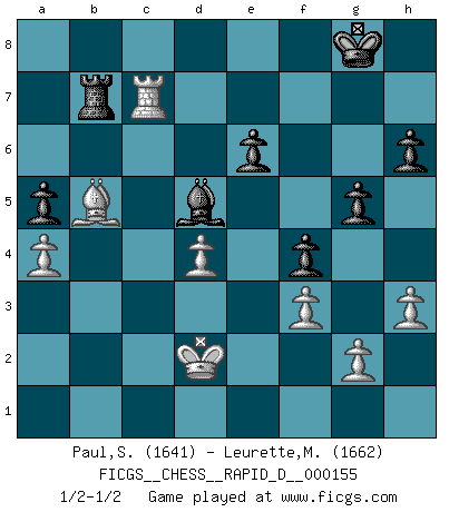 Last move : 1/2-1/2 2024 September 12 10:0:15 [Event "FICGS__CHESS__RAPID_D__000155"] [Site "FICGS"] [Date "2024.08.27"] [Round "1"] [White "Paul,Samagata"] [Black "Leurette,Marc-Antoine"] [Result "1/2-1/2"] [WhiteElo "1641"] [BlackElo "1662"] 1.d4 d5 2.c4 e6 3.a3 Nf6 4.Nc3 Be7 5.Nf3 O-O 6.Bf4 b6 7.h3 Bb7 8.e3 Nbd7 9.b4 c5 10.cxd5 Nxd5 11.Nxd5 Bxd5 12.bxc5 bxc5 13.Be2 cxd4 14.Qxd4 Qa5+ 15.Qd2 Qxd2+ 16.Kxd2 Nc5 17.Nd4 Bf6 18.Bd6 Rfc8 19.Bxc5 Rxc5 20.f3 Bxd4 21.exd4 R5c8 22.Rhc1 Rcb8 23.Rab1 g5 24.a4 a5 25.Rxb8+ Rxb8 26.Bb5 f5 27.Rc7 h6 28.Ke3 f4+ 29.Kd2 Rb7 1/2-1/2 Follow this game move after move (download)I had a toothache during the first game. In the second game I had a headache. In the third game it was an attack of rheumatism. In the fourth game, I wasn't feeling well. And in the fifth game? Well, must one have to win every game ? (Siegbert Tarrasch) Über Karpov: Er war und ist ein Vertreter der russischen Reaktionäre. Das steckt tief in seiner Seele, wehalb ich nicht nett mit ihm umgehen kann. (Viktor Kortschnoi) La enorme capacidad mental, en la que sin ella no puede un jugador de Ajedrez existir, es demasiado requerida por el Ajedrez al grado de que nunca podrá liberar su mente de este juego. (Albert Einstein) Des combinaisons [dans le jeu d'échecs] pareilles à des mélodies. Je crois entendre pour ainsi dire la musique des coups... (Vladimir Nabokov) Employ the attack like tactic of defense. (Chinese proverb)