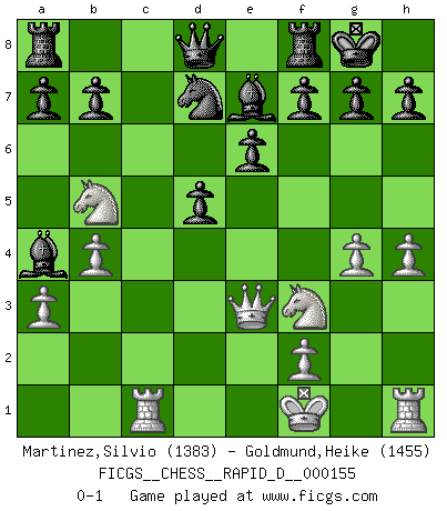 Last move : 0-1 2024 November 10 3:51:51 [Event "FICGS__CHESS__RAPID_D__000155"] [Site "FICGS"] [Date "2024.08.27"] [Round "1"] [White "Martinez,Silvio"] [Black "Goldmund,Heike"] [Result "0-1"] [WhiteElo "1383"] [BlackElo "1455"] 1.e4 d5 2.e5 Bf5 3.d4 e6 4.Nc3 c5 5.Bd3 Ne7 6.dxc5 Nec6 7.Be3 Nxe5 8.Nf3 Nxd3+ 9.Kf1 Nxc5 10.Ne5 Bd6 11.Nf3 O-O 12.h3 Nbd7 13.g4 Bg6 14.Nb5 Be7 15.b4 Na4 16.a3 Nb2 17.Qe2 Nc4 18.h4 Nxe3+ 19.Qxe3 Bxc2 20.Rc1 Ba4 0-1 This chess game has been lost on time (started : 2024.08.27 4:37:4) Follow this game move after move (download)Chess is a beautiful mistress. (Bent Larsen) Woher wissen wir, daß der Neanderthaler Blindschach gespielt hat? -- Bei Ausgrabungen wurden keine Schachbretter und Figuren gefunden. (Anonymous) El Ajedrez era la lengua materna de Capablanca. (Reti) Si je n'étais pas joueur d'échecs, je serais le meilleur dans quelque chose d'autre. (Anatoli Karpov) The Internet is the world's largest library. It's just that all the books are on the floor. (John Allen Paulos)