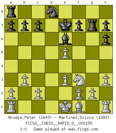 Last move : 1-0 2024 November 11 9:6:37 [Event "FICGS__CHESS__RAPID_D__000155"] [Site "FICGS"] [Date "2024.08.27"] [Round "1"] [White "Brodie,Peter"] [Black "Martinez,Silvio"] [Result "1-0"] [WhiteElo "1649"] [BlackElo "1383"] 1.Nf3 Nc6 2.d4 d5 3.Bf4 Nf6 4.Nc3 e5 5.dxe5 Ng4 6.h3 Nh6 7.Bxh6 gxh6 8.Nxd5 Be6 9.Nf6+ Ke7 10.Qxd8+ Nxd8 11.e3 Bg7 12.Nh5 Rg8 13.Nxg7 Rxg7 14.b3 1-0 This chess game has been lost on time (started : 2024.08.27 4:37:4) Follow this game move after move (download)I like the moment when I break a man's ego. (Bobby Fischer) Wenn Du nicht kämpfst, um anderen etwas zu beweisen, sondern nur für Dich selbst, dann bist du fast unbesiegbar. (Garry Kasparov) Cuando tengas duda... ¡juega al Ajedrez!. (Tevis) La vie est comme un jeu d'échecs : nous esquissons un plan, mais celui-ci est tributaire de ce que daignent faire l'adversaire aux échecs et le destin dans la vie. (Arthur Schopenhauer) Man is reluctant to give credit for intelligence to anyone, except his enemies. (Albert Einstein)