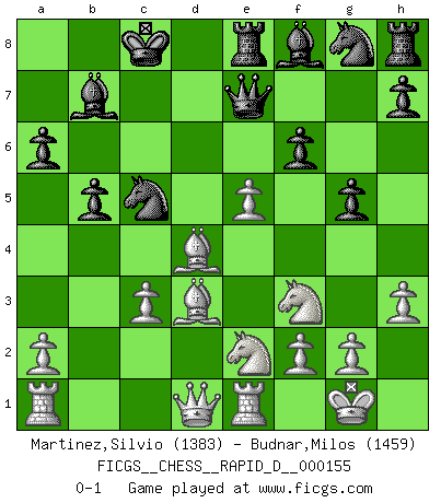 Last move : 0-1 2024 October 22 13:1:42 [Event "FICGS__CHESS__RAPID_D__000155"] [Site "FICGS"] [Date "2024.08.27"] [Round "1"] [White "Martinez,Silvio"] [Black "Budnar,Milos"] [Result "0-1"] [WhiteElo "1383"] [BlackElo "1459"] 1.e4 e5 2.Nf3 d6 3.d4 Nd7 4.Nc3 f6 5.Bd3 a6 6.O-O b5 7.b4 c6 8.h3 Bb7 9.Re1 Qb6 10.Bb2 exd4 11.Ne2 c5 12.Nf4 O-O-O 13.bxc5 Qc6 14.Bxd4 Re8 15.cxd6 Qxd6 16.c3 g5 17.Ne2 Nc5 18.e5 Qe7 0-1 This chess game has been lost on time (started : 2024.08.27 4:37:4) Follow this game move after move (download)What is the difference between chess and football? Everybody understands football, but nobody plays it. Everybody plays chess, but nobody understands it. Everything is relative. (Vladimir Kramnik) Weshalb minderdergeübte Spieler mit g2-g4 beginnen? Die betreffenden sind unschlüssig, ob sie nun rechts (h4) oder links (f4) beginnen sollen, und in ihrer Ratlosigkeit entschliessen sie sich nach guter Bürgerart dazu, den goldenen Mittelweg zu wählen. (Aaron Nimzowitsch) Yo he agregado estos principios a la ley: pongan los Caballos en acción antes de que los dos Alfiles sean desarrollados. (Emanuel Lasker) Aidez vos pièces, elles vous aideront. (Paul Morphy) Unless I accept my faults I will most certainly doubt my virtues. (Hugh Prather)
