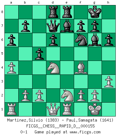 Last move : 0-1 2024 October 16 12:58:5 [Event "FICGS__CHESS__RAPID_D__000155"] [Site "FICGS"] [Date "2024.08.27"] [Round "1"] [White "Martinez,Silvio"] [Black "Paul,Samagata"] [Result "0-1"] [WhiteElo "1383"] [BlackElo "1641"] 1.e4 e5 2.Nf3 Nc6 3.Bb5 d6 4.Nc3 Nf6 5.O-O Be7 6.Re1 O-O 7.d3 h6 8.h3 Bd7 9.a4 a6 10.Bxc6 Bxc6 11.Be3 Qd7 12.d4 exd4 13.Nxd4 Rad8 14.Bf4 Rfe8 15.Nce2 Bxe4 16.Nc3 Bg6 17.Nce2 c5 0-1 This chess game has been lost on time (started : 2024.08.27 4:37:4) Follow this game move after move (download)Every Chess master was once a beginner. (Chernev) Den Ruhm habe ich schon, jetzt brauche ich noch das Geld. (Wilhelm Steinitz) Bobby Fischer es el jugador de Ajedrez mas grande que jamás haya existido. (Ken Smith) On peut tirer plus d'utilité d'une partie perdue que de 100 parties gagnées. (Capablanca) Establishing goals is all right if you don't let them deprive you of interesting detours. (Doug Larson)