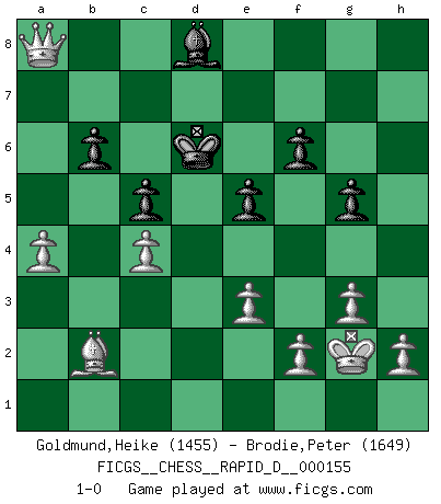 Last move : 1-0 2024 December 8 15:40:21 [Event "FICGS__CHESS__RAPID_D__000155"] [Site "FICGS"] [Date "2024.08.27"] [Round "1"] [White "Goldmund,Heike"] [Black "Brodie,Peter"] [Result "1-0"] [WhiteElo "1455"] [BlackElo "1649"] 1.b4 e5 2.Bb2 d6 3.e3 Nf6 4.c4 c5 5.b5 b6 6.d3 Be7 7.Nf3 O-O 8.Be2 Bb7 9.O-O Qc7 10.Nbd2 Nbd7 11.Qc2 h6 12.a4 a6 13.Nh4 g5 14.Nf5 Bd8 15.Nxh6+ Kg7 16.Nf5+ Kg8 17.Ne4 Nxe4 18.dxe4 Nf6 19.g3 Bxe4 20.Bd3 Qb7 21.Nxd6 Qd7 22.Nxe4 Nxe4 23.Bxe4 Rc8 24.Rad1 Qe7 25.Rd5 f6 26.Rfd1 Bc7 27.Rd7 Qe8 28.Bh7+ Kh8 29.Bg6 Qe6 30.Rh7+ Kg8 31.R1d7 Qxd7 32.Rxd7 Bd8 33.Bf7+ Rxf7 34.Rxf7 Kxf7 35.Qh7+ Ke6 36.Qb7 Rc7 37.Qd5+ Ke7 38.bxa6 Rd7 39.Qc6 Rd1+ 40.Kg2 Rd2 41.a7 Rd6 42.Qxd6+ Kxd6 43.a8Q 1-0 Follow this game move after move (download)Whoever sees no other aim in the game than that of giving checkmate to one's opponent will never become a good Chess player. (Euwe) Ich war schon mal beim Dopingtest. Da musste ich Urin abgeben, während Dritte zusahen. (Elisabeth Pähtz) El juego de Fischer siempre fue nítido, racional y brillante. Uno de los mejores por siempre. (Dave Regis) La solitude du joueur d'Echecs à l'approche du mat est semblable à celle du condamné. (Francis Szpiner) SEO proverb : Make your website optimized for human beings, not for search engines.