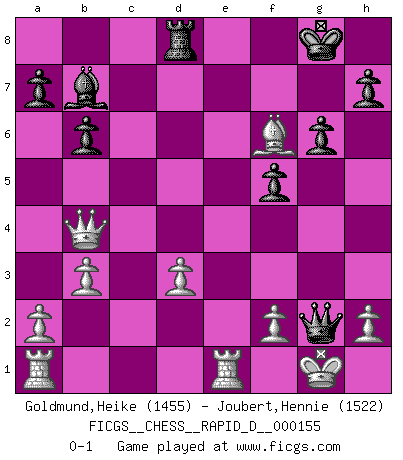Last move : 0-1 2024 November 4 13:37:53 [Event "FICGS__CHESS__RAPID_D__000155"] [Site "FICGS"] [Date "2024.08.27"] [Round "1"] [White "Goldmund,Heike"] [Black "Joubert,Hennie"] [Result "0-1"] [WhiteElo "1455"] [BlackElo "1522"] 1.d4 d5 2.Nf3 Nf6 3.Bg5 Ne4 4.Bd2 g6 5.Bb4 Bg7 6.e3 O-O 7.Bd3 f5 8.O-O Nc6 9.Ba3 Rf7 10.Nbd2 e5 11.dxe5 Nxe5 12.Nd4 b6 13.N2f3 Nxd3 14.cxd3 Nf6 15.b3 Bb7 16.Ne6 Qd7 17.Nxg7 Kxg7 18.Ne5 Qe6 19.Nxf7 Qxf7 20.Qc2 Rc8 21.Bb2 c5 22.Qc3 Rd8 23.Rfe1 d4 24.exd4 cxd4 25.Qb4 Kg8 26.Bxd4 Qd5 27.Bxf6 Qxg2+ 0-1 Follow this game move after move (download)Best by test: 1. e4 (Bobby Fischer) Oft bringt ein stiller Zug das Erdbeben. (Richard Reti) Entre mas años cumplo, mas valoro los Peones. (Keres) RxDa4 pat (...) Tree pose grows confidence. It roots me to this world. (Terri Guillemets)