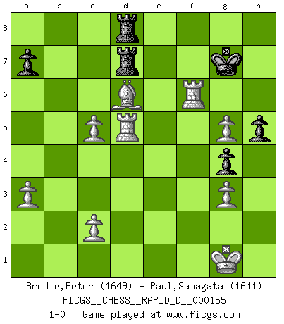 Last move : 1-0 2024 November 2 8:37:46 [Event "FICGS__CHESS__RAPID_D__000155"] [Site "FICGS"] [Date "2024.08.27"] [Round "1"] [White "Brodie,Peter"] [Black "Paul,Samagata"] [Result "1-0"] [WhiteElo "1649"] [BlackElo "1641"] 1.d4 d5 2.Nf3 c5 3.dxc5 Nc6 4.Bf4 Bf5 5.a3 e6 6.b4 Nf6 7.Nc3 Be7 8.e3 O-O 9.Bd3 Ne4 10.Bxe4 Bxe4 11.Nxe4 dxe4 12.Nd4 Nxd4 13.exd4 Bf6 14.O-O Bxd4 15.Bd6 Re8 16.Qxd4 Qh4 17.Rfe1 f5 18.g3 Qg4 19.Qd1 Qg6 20.f3 exf3 21.Qxf3 Qf7 22.Qf4 h6 23.Re5 g5 24.Qf3 h5 25.h4 g4 26.Qf4 Kh7 27.Rae1 Rad8 28.Qe3 Rd7 29.Qg5 b6 30.Rd1 Red8 31.Qd2 Qf6 32.Qg5 Qxg5 33.hxg5 Kg6 34.Rxe6+ Kf7 35.Rf6+ Kg7 36.Rxf5 Kg6 37.R1d5 bxc5 38.Rf6+ Kg7 39.bxc5 1-0 Follow this game move after move (download)Discovered check is the dive bomber of the Chessboard. (Reuben Fine) Das Schach ist nichts für kleine Geister, es beansprucht einen vollen Mann, der sich nicht sklavisch an das Überlieferte hält, sondern selbständig die Tiefen des Spiels zu ergründen sucht. (Wilhelm Steinitz) La batalla por la última verdad nunca sera ganada. Y es por eso que el Ajedrez es tan fascinante. (Hans Kmoch) Les Cavaliers se révèlent fort utiles dans les positions fermées. D'habitude, les Fous sont un peu plus forts que les Cavaliers dans les positions ouvertes. Qu'on le veuille ou non, il restera toujours des exceptions ! Luck has a peculiar habit of favoring those who don't depend on it. (Author unknown)