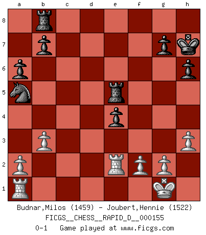 Last move : 0-1 2024 October 4 15:53:41 [Event "FICGS__CHESS__RAPID_D__000155"] [Site "FICGS"] [Date "2024.08.27"] [Round "1"] [White "Budnar,Milos"] [Black "Joubert,Hennie"] [Result "0-1"] [WhiteElo "1459"] [BlackElo "1522"] 1.e4 c5 2.Bc4 Nc6 3.Nf3 e6 4.O-O d6 5.c3 Nf6 6.d3 a6 7.Bg5 Be7 8.h3 O-O 9.d4 cxd4 10.cxd4 h6 11.Bh4 Nxe4 12.Bxe7 Qxe7 13.d5 Na5 14.Bd3 exd5 15.Bxe4 dxe4 16.Nd4 d5 17.b3 f5 18.Nc3 f4 19.Nxd5 Qe5 20.Nb6 Rb8 21.Ne2 f3 22.Qd5 Qxd5 23.Nxd5 fxe2 24.Rfe1 Bf5 25.Ne7 Kh7 26.Nxf5 Rxf5 27.Rxe2 Re5 0-1 Follow this game move after move (download)Chess opens and enriches your mind. (Saudin Robovic) Lisa Lane, amerikanische Schachmeisterin, hatte Fischer einmal als stärksten lebenden Spieler bezeichnet. Antwort: Das ist richtig, aber Lisa Lane ist eigentlich nicht in der Lage, das zu beurteilen. (Robert James Fischer) De todos mis libros Rusos, la defensa contiene y difunde el 'calor' mas grande que pudiese verse extraño al observar lo supremamente abstracto que el Ajedrez supuestamente es. (Vladimir Nabokov) Psychologiquement, tu dois avoir confiance en toi même, mais cette confiance doit être basée sur des faits. (Robert Fischer) What doesn't kill us makes us stronger. (Friedrich Nietzsche)
