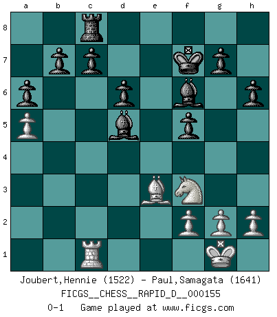 Last move : 0-1 2024 October 9 20:26:2 [Event "FICGS__CHESS__RAPID_D__000155"] [Site "FICGS"] [Date "2024.08.27"] [Round "1"] [White "Joubert,Hennie"] [Black "Paul,Samagata"] [Result "0-1"] [WhiteElo "1522"] [BlackElo "1641"] 1.e4 e5 2.Bc4 h6 3.d4 exd4 4.Nf3 Nc6 5.c3 dxc3 6.Qb3 Qe7 7.O-O Nf6 8.Nxc3 Na5 9.Qa4 Nxc4 10.Qxc4 d6 11.Nd5 Nxd5 12.exd5 Qd8 13.Re1+ Be7 14.Qe4 f5 15.Qe2 Kf7 16.Bf4 Re8 17.Qd3 Bf6 18.Rxe8 Qxe8 19.Re1 Qa4 20.Bc1 Bd7 21.a3 Bb5 22.Qd1 Qc4 23.b3 Qd3 24.Qxd3 Bxd3 25.Be3 a6 26.Rc1 Rc8 27.a4 Be4 28.Rd1 Bc2 29.Rc1 Bxb3 30.a5 Bxd5 0-1 Follow this game move after move (download)I guess a certain amount of temperament is expected of Chess geniuses. (Ron Gross) Im Reiche der Wirklichkeit ist man nie so glücklich wie im Reiche der Gedanken. (Arthur Schopenhauer) La enorme capacidad mental, en la que sin ella no puede un jugador de Ajedrez existir, es demasiado requerida por el Ajedrez al grado de que nunca podrá liberar su mente de este juego. (Albert Einstein) Les échecs sont plus proches de l'art de l'assassinat que de l'art de la guerre. (Arturo Perez-Reverte) Plans are ideas that never come to fruition. (Daniel Parmet)