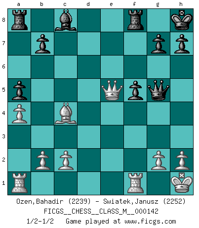 Last move : 1/2-1/2 2024 September 28 21:33:21 [Event "FICGS__CHESS__CLASS_M__000142"] [Site "FICGS"] [Date "2024.08.27"] [Round "1"] [White "Ozen,Bahadir"] [Black "Swiatek,Janusz"] [Result "1/2-1/2"] [WhiteElo "2239"] [BlackElo "2252"] 1.e4 c5 2.Nf3 Nc6 3.d4 cxd4 4.Nxd4 Nf6 5.Nc3 e5 6.Ndb5 d6 7.Nd5 Nxd5 8.exd5 Nb8 9.a4 Be7 10.Be2 O-O 11.O-O Nd7 12.Bd2 a6 13.Na3 a5 14.Kh1 f5 15.f4 Nf6 16.Nc4 Nxd5 17.fxe5 dxe5 18.Nxe5 Bf6 19.Bc4 Bxe5 20.Bg5 Qxg5 21.Qxd5+ Kh8 22.Qxe5 1/2-1/2 Follow this game move after move (download)It is not a move, even the best move that you must seek, but a realizable plan. (Eugene Znosko-Borovsky) Gott hat gewollt, dass ich Champion werde. (Surab Azmajparaschvili) El Ajedrez era la lengua materna de Capablanca. (Reti) A chaque perte on perd un peu de soi. (Joël Lautier) Computers have lots of memory but no imagination. (Anonymous)