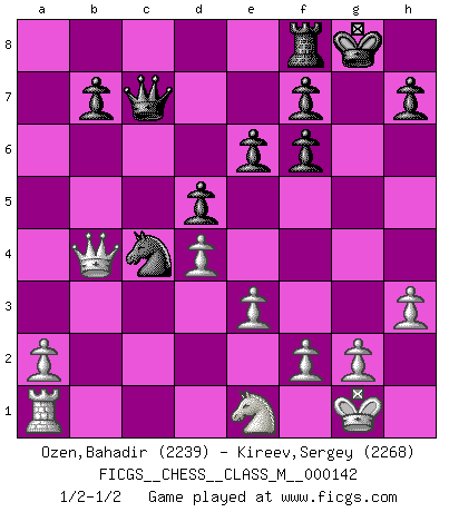 Last move : 1/2-1/2 2024 September 1 8:25:37 [Event "FICGS__CHESS__CLASS_M__000142"] [Site "FICGS"] [Date "2024.08.27"] [Round "1"] [White "Ozen,Bahadir"] [Black "Kireev,Sergey"] [Result "1/2-1/2"] [WhiteElo "2239"] [BlackElo "2268"] 1.d4 d5 2.c4 c6 3.cxd5 cxd5 4.Bf4 Nc6 5.e3 Nf6 6.Nc3 Bf5 7.Qb3 Na5 8.Qa4+ Bd7 9.Qc2 Rc8 10.Bd3 e6 11.Nf3 Bb4 12.O-O O-O 13.Rfc1 a6 14.h3 Bxc3 15.bxc3 Bb5 16.Bxb5 axb5 17.Bg5 b4 18.Qb2 bxc3 19.Rxc3 Rxc3 20.Qxc3 Nc4 21.Qb4 Qc7 22.Bxf6 gxf6 23.Ne1 1/2-1/2 Follow this game move after move (download)You sit at the board and suddenly your heart leaps. Your hand trembles to pick up the piece and move it. But what Chess teaches you is that you must sit there calmly and think about whether it's really a good idea and whether there are other better ideas. (Stanley Kubrick) Schach ist Krieg, im Schach geht es um testosterongesteuerte Urschreie. (Garry Kasparov) Hay dos clases de hombres: aquellos que se conforman en dejarse llevar por las circunstancias y que juegan barajas y aquellos decididos a controlar las circunstancias y que juegan al Ajedrez. (Mortimer Collins) Je ne suis pas le dernier à jouer lâchement des coups douteux pendant le zeïtnot de l'adversaire pour l'achever: en effet les coups qui font le plus peur sont ceux que l'on ne comprend pas. Je me fais souvent peur quand je joue. (Un professeur anonyme) Life is like a game of cards: the hand you are dealt represents determinism; the way you play it is free will. (Jawaharlal Nehru)