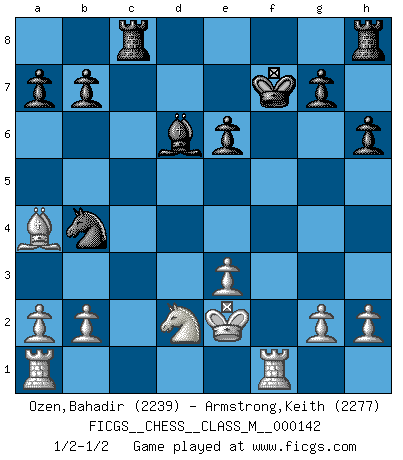 Last move : 1/2-1/2 2024 September 10 8:43:18 [Event "FICGS__CHESS__CLASS_M__000142"] [Site "FICGS"] [Date "2024.08.27"] [Round "1"] [White "Ozen,Bahadir"] [Black "Armstrong,Keith"] [Result "1/2-1/2"] [WhiteElo "2239"] [BlackElo "2277"] 1.d4 Nf6 2.c4 e6 3.Nf3 d5 4.Nc3 c5 5.cxd5 cxd4 6.Qxd4 exd5 7.e4 dxe4 8.Qxd8+ Kxd8 9.Ng5 Be6 10.Nxe6+ fxe6 11.Bg5 Nc6 12.Bc4 Ke7 13.Nxe4 Kf7 14.Nd2 h6 15.Be3 Ng4 16.Bb5 Nb4 17.Ke2 Nxe3 18.fxe3 Bd6 19.Ba4 Rac8 20.Rhf1+ 1/2-1/2 Follow this game move after move (download)Chess is like war on a board. (Bobby Fischer) Ich kämpfe solange mein Gegner einen Fehler machen kann. (Emanuel Lasker) Solo existe una cosa que Fischer hace en el Ajedrez sin placer: ¡perder!. (Boris Spassky) C'est une question de caractère, Beaucoup de gens perdent leur motivation très vite. D'autres, ils sont rares, peuvent la conserver très longtemps. J'aime les échecs, encore aujourd'hui je suis heureux d'analyser des parties. J'aime toujours gagner, je déteste encore perdre. Bien jouer est important pour mon intégrité intellectuelle et morale. Et puis les échecs vivent en ce moment une période historique grâce à Internet. Ils se développent dans les systèmes éducatifs à travers le monde. Ils sortent de leur ghetto, et c'est mon rôle de mener à bien cette révolution. (Gary Kasparov) It's unlucky to be superstitious. (Dave Enteles)