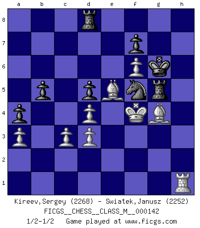 Last move : 1/2-1/2 2024 November 9 4:34:39 [Event "FICGS__CHESS__CLASS_M__000142"] [Site "FICGS"] [Date "2024.08.27"] [Round "1"] [White "Kireev,Sergey"] [Black "Swiatek,Janusz"] [Result "1/2-1/2"] [WhiteElo "2268"] [BlackElo "2252"] 1.c4 e5 2.g3 Nf6 3.Bg2 Bc5 4.Nc3 c6 5.Nf3 e4 6.Nh4 d5 7.cxd5 cxd5 8.d3 Ng4 9.O-O g5 10.d4 Bb4 11.h3 gxh4 12.hxg4 Nc6 13.f3 hxg3 14.g5 Bxc3 15.bxc3 e3 16.f4 O-O 17.Qd3 Re8 18.Rb1 a6 19.Bxe3 Qe7 20.Rf3 Bg4 21.Rxg3 Qd7 22.Rxg4 Qxg4 23.Kf2 Qh4+ 24.Kf3 Qh5+ 25.Kg3 Ne7 26.Bf3 Qg6 27.Bd2 Qxd3 28.exd3 h6 29.gxh6 Kh7 30.Kf2 b5 31.f5 Rad8 32.f6 Nf5 33.Bg4 Nd6 34.Bf3 Nf5 35.Bg4 Nd6 36.Bf4 Rg8 37.Rg1 Rg6 38.Be5 Rxh6 39.Kf3 Rg6 40.Ra1 Rg5 41.Kf4 Kg6 42.Rg1 Kh6 43.Rh1+ Kg6 44.Rh3 a5 45.Rg3 Kh6 46.a3 a4 47.Rh3+ Kg6 48.Rh1 Nf5 1/2-1/2 Follow this game move after move (download)Pawns are born free, yet they are everywhere in chains. (Rick Kennedy) Herr Iljumschinow ist ein etwas merkwürdiger Geschäftsmann: Er arbeitet zusammen mit Leuten wie Muammar al-Gaddafi; früher ist das Saddam Hussein gewesen. (Joel Lautier) Todo se encuentra en un estado de flujo y esto incluye al mundo del Ajedrez. (Mikhail Botvinnik) Roi des jeux et jeu des rois, les échecs portent en eux un sentiment d'infini. Ils donnent à celui qui s'est efforcé d'en approfondir les arcanes l'impression de n'être pas à la mesure de l'homme; en fait, ils constituent un résumé de l'univers, un microcosme, et figurent cette grande échelle qui, dans les plans de la lumière descend jusqu'à la matière, qui des abîmes insondables remonte jusqu'en l'infini de Dieu. (Pyrame) There are two kinds of people in the world, my friend. Those who have a loaded gun and those who dig. You dig ! (Blondie in The Good, The Bad and The Ugly)