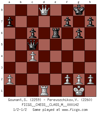 Last move : 1/2-1/2 2024 September 9 0:31:7 [Event "FICGS__CHESS__CLASS_M__000142"] [Site "FICGS"] [Date "2024.08.27"] [Round "1"] [White "Gounant,Stanislas"] [Black "Perevozchikov,Vjacheslav"] [Result "1/2-1/2"] [WhiteElo "2259"] [BlackElo "2260"] 1.b3 e6 2.Bb2 Nf6 3.Nf3 d5 4.e3 c5 5.c4 Nc6 6.cxd5 exd5 7.Be2 d4 8.exd4 cxd4 9.Bb5 Bc5 10.Bxc6+ bxc6 11.Qe2+ Be6 12.Qe5 Qb6 13.Bxd4 Bxd4 14.Nxd4 O-O 15.Nxe6 Rfe8 16.O-O Rxe6 17.Qf4 Rd8 18.Na3 Rd4 19.Qf3 Ne4 20.Nc4 Rxc4 21.bxc4 Nxd2 22.Qd3 Nxf1 23.Rb1 Nd2 24.Rd1 g6 25.Qxd2 Qc5 26.Qd8+ 1/2-1/2 Follow this game move after move (download)I believe that Chess possesses a magic that is also a help in advanced age. A rheumatic knee is forgotten during a game of Chess and other events can seem quite unimportant in comparison with a catastrophe on the chessboard. (Vlastimil Hort) Der Schachmeister von Heute braucht Courage, einen Killerinstinkt, Ausdauer und Arroganz. (Larry Evans) El Rey es una pieza de pelea. ¡Usenlo!. (Wilhelm Steinitz) Les Echecs sont affaire de jugement sensible. Savoir quand frapper et quand esquiver. (Fischer) . 'gn is not allowed in chess unless n is an integer between 1 and 8 inclusive, where 1 and 8 are to interpreted as the standard numerals standing for integers in the ordered real-closed field R, with the *canonical* ordering. (As opposed to, say, an integer in the domain Z[2+i*sqrt(5)] or an integer in some exotic Grothendieck topos). (Normajean Yates)