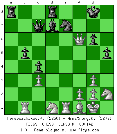 Last move : 1-0 2024 September 18 23:30:50 [Event "FICGS__CHESS__CLASS_M__000142"] [Site "FICGS"] [Date "2024.08.27"] [Round "1"] [White "Perevozchikov,Vjacheslav"] [Black "Armstrong,Keith"] [Result "1-0"] [WhiteElo "2260"] [BlackElo "2277"] 1.Nf3 d5 2.d4 Nf6 3.Bf4 c5 4.c3 Nc6 5.e3 Nh5 6.Bg3 Nxg3 7.hxg3 e6 8.Nbd2 Bd7 9.Bd3 Qb6 10.Rb1 g6 11.O-O Bg7 12.Re1 O-O 13.Bf1 Rfd8 14.Nb3 c4 15.Nc5 Qc7 16.e4 Bc8 17.e5 b6 18.Na4 Bd7 19.b3 Ne7 20.Nb2 b5 21.Qd2 h5 22.Nh2 f6 23.exf6 Bxf6 24.a4 a6 25.Nd1 e5 26.dxe5 Bxe5 27.axb5 axb5 28.bxc4 dxc4 29.Qg5 Bf6 30.Qxf6 1-0 Follow this game move after move (download)Chess demands total concentration. (Bobby Fischer) Im Schach gewinnt jeder. Hat man Freunde am Spiel - und das ist die Hauptsache - ist auch der Verlust einer Partie kein Unglück. (David Bronstein) ¿Esta Bobby Fischer algo cuerdo?. (Salo Flohr) Toutes les manuvres exécutées sur une colonne ouverte ont pour but ultime l'intrusion définitive sur la septième ou la huitième rangée, en plein cur de la position ennemie. (Aaron Nimzovitch) At work, the authority of a person is inversely proportional to the number of pens that person is carrying. (Dan Rotaru)