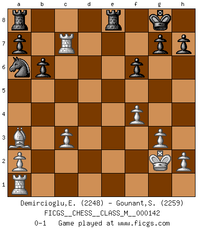 Last move : 0-1 2025 January 4 21:57:9 [Event "FICGS__CHESS__CLASS_M__000142"] [Site "FICGS"] [Date "2024.08.27"] [Round "1"] [White "Demircioglu,Emre"] [Black "Gounant,Stanislas"] [Result "0-1"] [WhiteElo "2248"] [BlackElo "2259"] 1.c4 b6 2.Nc3 Bb7 3.Nf3 e6 4.e3 Nf6 5.g3 Bb4 6.Bg2 Bxc3 7.bxc3 e5 8.O-O d6 9.e4 Nxe4 10.d4 O-O 11.Ng5 d5 12.cxd5 Nxg5 13.dxe5 f6 14.e6 Nxe6 15.dxe6 Bxg2 16.Kxg2 Qxd1 17.Rxd1 Re8 18.f4 Rxe6 19.Rd8+ Kf7 20.Rc8 Re8 21.Rxc7+ Kg8 22.Ba3 Na6 0-1 Follow this game move after move (download)Chess is 99 percent tactics. (Teichmann) Mein erstes Ziel war nicht, die Partie zu gewinnen, sondern eine Figur zu opfern. -- der junge (Wilhelm Steinitz) Bobby Fischer es el jugador de Ajedrez mas grande que jamás haya existido. (Ken Smith) On croit qu'il y a plus de mauvais joueurs que de bons joueurs, c'est faux : Il y a autant de joueurs qui gagnent que de joueurs qui perdent. (Philippe Geluck) The right perception of any matter and a misunderstanding of the same matter do not wholly exclude each other. (Kafka's the trial)