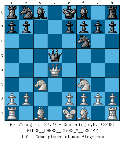 Last move : 1-0 2024 October 10 16:47:22 [Event "FICGS__CHESS__CLASS_M__000142"] [Site "FICGS"] [Date "2024.08.27"] [Round "1"] [White "Armstrong,Keith"] [Black "Demircioglu,Emre"] [Result "1-0"] [WhiteElo "2277"] [BlackElo "2248"] 1.Nf3 d5 2.d4 c5 3.c4 Nf6 4.cxd5 cxd4 5.Qa4+ Qd7 6.Qxd4 Qxd5 7.Nc3 1-0 This chess game has been lost on time (started : 2024.08.27 12:42:29) Follow this game move after move (download)Chess is everything: art, science and sport. (Anatoly Karpov) Ich war schon mal beim Dopingtest. Da musste ich Urin abgeben, während Dritte zusahen. (Elisabeth Pähtz) El Ajedrez es una guerra en un tablero. El objetivo es aplastar la mente del oponente. (Bobby Fischer) J'ai vu le vaincu d'Echecs jouer des années durant dans l'espoir de la fête de la victoire. Car tu es plus riche de ce qu'elle existe si même elle n'est point pour toi. Ainsi de la perle du fond des mers. (Antoine de Saint-Exupéry) A computer lets you make more mistakes faster than any invention in human history - with the possible exceptions of handguns and tequila. (Mitch Ratcliffe)