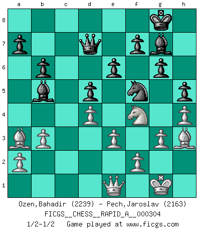 Last move : 1/2-1/2 2024 October 24 14:43:28 [Event "FICGS__CHESS__RAPID_A__000304"] [Site "FICGS"] [Date "2024.08.29"] [Round "1"] [White "Ozen,Bahadir"] [Black "Pech,Jaroslav"] [Result "1/2-1/2"] [WhiteElo "2239"] [BlackElo "2163"] 1.d4 Nf6 2.c4 g6 3.g3 c6 4.Nf3 Bg7 5.Bg2 d5 6.cxd5 cxd5 7.O-O O-O 8.Nc3 Ne4 9.Nd2 Nxd2 10.Qxd2 Nc6 11.e3 e6 12.b3 Re8 13.Rd1 b6 14.Ba3 Ba6 15.Ne2 Qd7 16.Nf4 Rec8 17.Rac1 Ne7 18.h4 h5 19.Rxc8+ Rxc8 20.Rc1 Rxc1+ 21.Qxc1 Nf5 22.Bh3 Bb5 23.Qe1 1/2-1/2 Follow this game move after move (download)If I win a tournament, I win it by myself. I do the playing. Nobody helps me. (Bobby Fischer) Wie ich sie so einen nach dem anderen nieder mähte wurde meine Überlegenheit offensichtlich. (José Raúl Capablanca) El Ajedrez es una hermosa aventura. (Bent Larsen) On a dit que l'homme se distingue de l'animal par le fait qu'il achète plus de livres qu'il ne peut en lire. Je voudrais suggérer qu'inclure à la liste des livres quelques livres d'échecs rendrait la distinction manifeste. (Edward Lasker) I would love to change the world, but they won't give me the source code. (Unknown)