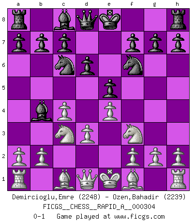 Last move : 0-1 2024 October 5 1:40:54 [Event "FICGS__CHESS__RAPID_A__000304"] [Site "FICGS"] [Date "2024.08.29"] [Round "1"] [White "Demircioglu,Emre"] [Black "Ozen,Bahadir"] [Result "0-1"] [WhiteElo "2248"] [BlackElo "2239"] 1.c4 e5 2.Nc3 Nf6 3.Nf3 Nc6 4.e4 Bb4 5.d3 d6 0-1 This chess game has been lost on time (started : 2024.08.29 23:58:13) Follow this game move after move (download)Dazzling combinations are for the many, shifting wood is for the few. (Georg Kieninger) Das Schach hält seine Meister in eigenen Banden, Fesseln; auf vielerlei Weise formt es ihren Geist, so dass die innere Freiheit selbst des Stärksten beeinflusst wird. (Albert Einstein) El Ajedrez, como cualquier otra actividad creativa, puede existir solo a través de méritos combinados de aquellos que tienen talento creativo y de aquellos que tienen la habilidad de organizar un trabajo creativo. (Mikhail Botvinnik) C'est une question de caractère, Beaucoup de gens perdent leur motivation très vite. D'autres, ils sont rares, peuvent la conserver très longtemps. J'aime les échecs, encore aujourd'hui je suis heureux d'analyser des parties. J'aime toujours gagner, je déteste encore perdre. Bien jouer est important pour mon intégrité intellectuelle et morale. Et puis les échecs vivent en ce moment une période historique grâce à Internet. Ils se développent dans les systèmes éducatifs à travers le monde. Ils sortent de leur ghetto, et c'est mon rôle de mener à bien cette révolution. (Gary Kasparov) There's no money in correspondence chess. (John Knudsen)