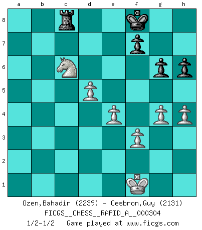 Last move : 1/2-1/2 2024 October 10 1:39:12 [Event "FICGS__CHESS__RAPID_A__000304"] [Site "FICGS"] [Date "2024.08.29"] [Round "1"] [White "Ozen,Bahadir"] [Black "Cesbron,Guy"] [Result "1/2-1/2"] [WhiteElo "2239"] [BlackElo "2131"] 1.d4 Nf6 2.c4 g6 3.Nc3 d5 4.Nf3 Bg7 5.cxd5 Nxd5 6.e4 Nxc3 7.bxc3 c5 8.Rb1 O-O 9.Be2 cxd4 10.cxd4 Qa5+ 11.Bd2 Qxa2 12.O-O Bg4 13.Be3 Nc6 14.d5 Ne5 15.Rxb7 a5 16.Rxe7 a4 17.Re1 a3 18.Nxe5 Bxe2 19.Rxe2 Qxe2 20.Qxe2 a2 21.Bd4 a1Q+ 22.Bxa1 Rxa1+ 23.Qf1 Rxf1+ 24.Kxf1 Bf6 25.Nc6 Bxe7 26.Nxe7+ Kg7 27.Nc6 Rc8 28.g4 h6 29.h4 Kf8 30.f3 1/2-1/2 Follow this game move after move (download)Play the opening like a book, the middle game like a magician, and the endgame like a machine. (Spielmann) Ein Großmeister muß tausende Partien in seinem Kopf speichern, denn diese sind für Ihn, was die Worte der Muttersprache für gewöhnliche Leute sind, oder Noten für Musiker... (Garry Kasparov) Me siento como si fuera una pieza en una partida de Ajedrez, cuando mi oponente me indica: esa pieza no puede ser movida. (Soren Kierkegaard) Mon pion favori sur ma case favorite ! Bronstein en parlant d'un coup de pion en h5 quand il avait les Noirs. Information on the Internet is subject to the same rules and regulations as conversation at a bar. (George Lundberg)