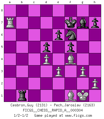 Last move : 1/2-1/2 2024 December 15 2:50:15 [Event "FICGS__CHESS__RAPID_A__000304"] [Site "FICGS"] [Date "2024.08.29"] [Round "1"] [White "Cesbron,Guy"] [Black "Pech,Jaroslav"] [Result "1/2-1/2"] [WhiteElo "2131"] [BlackElo "2163"] 1.Nf3 Nf6 2.g3 g6 3.Bg2 Bg7 4.c4 O-O 5.O-O c6 6.b3 Ne4 7.d4 d5 8.Bb2 Bf5 9.Nbd2 a5 10.Nh4 Nxd2 11.Qxd2 Be6 12.f4 Nd7 13.f5 gxf5 14.Nxf5 Bxf5 15.Rxf5 e6 16.R5f1 f5 17.Rad1 a4 18.Ba3 Rf7 19.cxd5 cxd5 20.Bd6 axb3 21.axb3 Qb6 22.Bf4 Qxb3 23.Rb1 Qa2 24.Qxa2 Rxa2 25.e3 Nf6 26.Rb6 Ra6 27.Rxa6 bxa6 28.Ra1 Ra7 29.Ra5 Kf7 30.Bf1 Rb7 31.Rxa6 Rb1 32.Ra7+ Kg6 33.Ra6 Kf7 34.Ra7+ 1/2-1/2 Follow this game move after move (download)At this time Fischer is simply a level above all the best Chessplayers in the world. (John Jacobs) Im Schach gibt es keinen Platz für Galanterie. (Irving Chernev) Aquellos que dicen entender al Ajedrez, no entienden nada. (Robert Hubner) Des idées, des idées, j'en ai cent, j'en ai mille. Des bonnes, des mauvaises, applicables, irréalisables... Il suffit de faire le tri ! (Roos) Whoever said the pen is mightier than the sword obviously never encountered automatic weapons. (US General Douglas MacArthur)