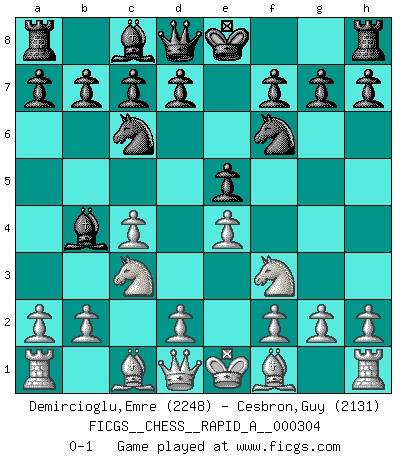 Last move : 0-1 2024 October 4 0:13:16 [Event "FICGS__CHESS__RAPID_A__000304"] [Site "FICGS"] [Date "2024.08.29"] [Round "1"] [White "Demircioglu,Emre"] [Black "Cesbron,Guy"] [Result "0-1"] [WhiteElo "2248"] [BlackElo "2131"] 1.c4 e5 2.Nc3 Nf6 3.Nf3 Nc6 4.e4 Bb4 0-1 This chess game has been lost on time (started : 2024.08.29 23:58:13) Follow this game move after move (download)Chess is in its essence a game, in its form an art, and in its execution a science. (Baron Tassilo) Jeder weiß, dass Gasprom Putins persönliches Machtinstrument ist. Die Firma wird vom Kreml aus geleitet und wird schon deshalb nie transparent sein. (Garry Kasparov) Si pudieramos observar el interior de la cabeza de un jugador de Ajedrez, encontraríamos ahí un mundo lleno de sentimientos, imágenes, ideas, emoción y pasión. (Alfred Binet) On croit qu'il y a plus de mauvais joueurs que de bons joueurs, c'est faux : Il y a autant de joueurs qui gagnent que de joueurs qui perdent. (Philippe Geluck) Pretend inferiority and encourage his arrogance. (Sun Tzu)