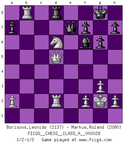 Last move : 1/2-1/2 2007 November 14 6:38:7 [Event "FICGS__CHESS__CLASS_A__000028"] [Site "FICGS"] [Date "2007.09.20"] [Round "1"] [White "Borisovs,Leonids"] [Black "Markus,Roland"] [Result "1/2-1/2"] [WhiteElo "2137"] [BlackElo "2080"] 1.Nf3 Nf6 2.c4 e6 3.d4 b6 4.g3 Bb7 5.Bg2 Be7 6.O-O O-O 7.d5 exd5 8.Nh4 c6 9.cxd5 Nxd5 10.Nf5 Nc7 11.Nc3 d5 12.e4 Bf6 13.exd5 cxd5 14.Bf4 Nba6 15.Re1 Bc8 16.Nd6 Be6 17.Nxd5 Nxd5 18.Bxd5 Bxd5 19.Qxd5 Bxb2 20.Rad1 Nc5 21.Be3 Qc7 22.Rd2 Bf6 23.Rc1 Rfd8 24.Bxc5 bxc5 25.Rxc5 Qe7 26.Rb5 g6 27.Kg2 Rab8 28.Rxb8 1/2-1/2 Reti Opening Kingside Castling by player White (move 6) Kingside Castling by player Black (move 6) This chess game ended in a draw. Follow this game move after move (download)Adequate compensation for a sacrifice is having a sound combination leading to a winning position; adequate compensation for a blunder is having your opponent snatch defeat from the jaws of victory. (Bruce A. Moon) Über die Verhaftung Bobby Fischers: Warum es die Bush-Administration für nötig befindet einen 61 Jahre alten Mann zu hetzten, der für niemanden ausser sich selbste eine Gefahr darstellt ist ein Rätsel. (Nigel Short) La esencia del Ajedrez es pensar acerca de lo que el Ajedrez es. (David Bronstein) Tout change constamment, y compris dans le monde des Echecs. (Botvinnik) Perhaps the current trend of many chess professionals taking up the more lucrative pastime of poker is not a wholly negative one. It may not be too late for humans to relearn how to take risks in order to innovate and thereby maintain the advanced lifestyles we enjoy. And if it takes a poker-playing supercomputer to remind us that we can't enjoy the rewards without taking the risks, so be it. (The Chess Master and the Computer, by Garry Kasparov - 2010)