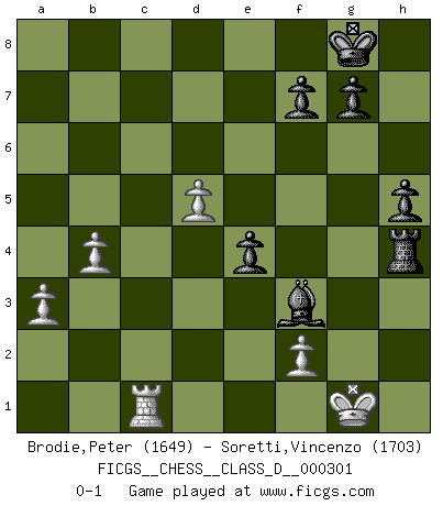 Last move : 0-1 2025 March 2 12:45:20 [Event "FICGS__CHESS__CLASS_D__000301"] [Site "FICGS"] [Date "2024.09.08"] [Round "1"] [White "Brodie,Peter"] [Black "Soretti,Vincenzo"] [Result "0-1"] [WhiteElo "1649"] [BlackElo "1703"] 1.Nf3 d5 2.d4 Nf6 3.Bf4 Nc6 4.Nc3 e6 5.Nb5 Bd6 6.e3 Bxf4 7.exf4 O-O 8.Be2 a6 9.Nc3 b6 10.O-O Ne7 11.Ne5 c5 12.dxc5 bxc5 13.Na4 Qc7 14.b3 d4 15.Bd3 Nc6 16.Nxc5 Nxe5 17.fxe5 Qxe5 18.b4 Qd5 19.Qf3 Qxf3 20.gxf3 Nd5 21.Be4 Rd8 22.Rfe1 Rb8 23.Nxa6 Bxa6 24.Bxd5 Rxd5 25.a3 Rg5+ 26.Kh1 e5 27.h4 Rf5 28.Kg2 Bb7 29.c3 Bxf3+ 30.Kg3 e4 31.cxd4 Rb6 32.Rac1 Rg6+ 33.Kh2 h5 34.Rg1 Rxg1 35.Kxg1 Rf4 36.d5 Rxh4 0-1 Follow this game move after move (download)I have added these principles to the law: get the Knights into action before both Bishops are developed. (Emanuel Lasker) Im Schach gewinnt jeder. Hat man Freunde am Spiel - und das ist die Hauptsache - ist auch der Verlust einer Partie kein Unglück. (David Bronstein) El Ajedrez lo es todo: arte, ciencia y deporte. (Anatoly Karpov) Les échecs sont un jeu terrible. Si vous n'avez pas le centre, votre adversaire a une position plus libre. Par contre, si vous avez le centre, alors vous avez vraiment quelque chose pour laquelle vous inquiéter ! (Siegbert Tarrasch) Without enthusiasm, virtue functions not at all, and vice only poorly. (Mignon McLaughlin, The Neurotic's Notebook, 1960)