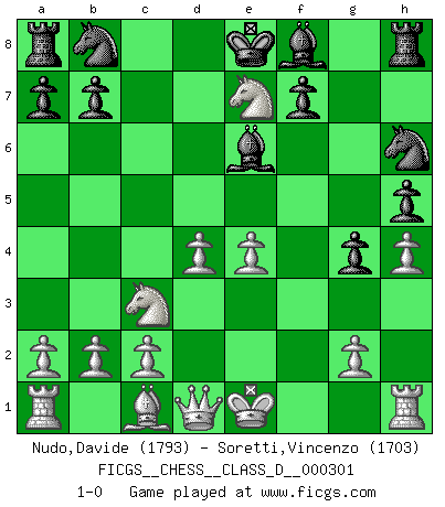 Last move : 1-0 2024 September 15 13:3:14 [Event "FICGS__CHESS__CLASS_D__000301"] [Site "FICGS"] [Date "2024.09.08"] [Round "1"] [White "Nudo,Davide"] [Black "Soretti,Vincenzo"] [Result "1-0"] [WhiteElo "1793"] [BlackElo "1703"] 1.e4 e5 2.f4 exf4 3.Nf3 g5 4.h4 g4 5.Ne5 h5 6.Bc4 Nh6 7.d4 d6 8.Nd3 Qe7 9.Nc3 c6 10.Nxf4 d5 11.Bxd5 cxd5 12.Nfxd5 Be6 13.Nxe7 1-0 Follow this game move after move (download)Chess is a foolish expedient for making idle people believe they are doing something very clever when they are only wasting their time. (George Bernard Shaw) Es gibt zwei Arten von Opfern: Korrekte und meine. (Mikhail Nekhemyevich Tal) El jugador táctico debe saber que hacer cuando algo se debe de hacer. El estratégico debe saber que hacer cuando nada se debe de hacer. (Savielly Tartakover) Une platitude souvent récitée à propos des Echecs est qu'une des choses les plus difficiles à réaliser est de gagner une position gagnante. Cela ne manque pas de sens mais, pour ma part, j'ai toujours trouvé plus difficile de gagner une position perdante. (Tim Krabbe) Luck is what you have left over after you give 100 percent. (Langston Coleman)