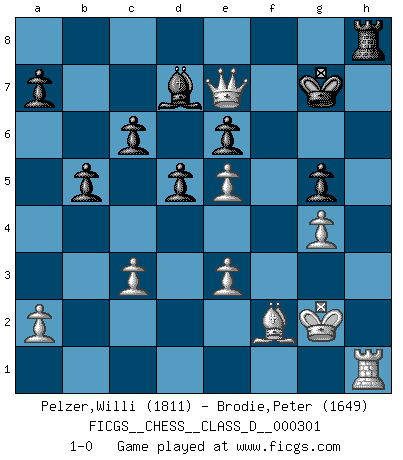 Last move : 1-0 2025 January 25 17:34:31 [Event "FICGS__CHESS__CLASS_D__000301"] [Site "FICGS"] [Date "2024.09.08"] [Round "1"] [White "Pelzer,Willi"] [Black "Brodie,Peter"] [Result "1-0"] [WhiteElo "1811"] [BlackElo "1649"] 1.d4 d5 2.c4 e6 3.Nc3 Bb4 4.Nf3 f5 5.Bg5 Nf6 6.e3 O-O 7.Bd3 Bxc3+ 8.bxc3 Nc6 9.O-O h6 10.Bh4 Qd6 11.c5 Qe7 12.Ne5 Nxe5 13.dxe5 Nd7 14.Bxe7 Re8 15.Bh4 Nxc5 16.f3 g5 17.Bf2 Nxd3 18.Qxd3 c6 19.h3 Bd7 20.g4 Rf8 21.h4 Rae8 22.hxg5 hxg5 23.Kg2 Rf7 24.Rh1 Rh7 25.Rxh7 Kxh7 26.Rh1+ Kg7 27.Qb1 b5 28.Qb4 fxg4 29.fxg4 Rh8 30.Qe7+ 1-0 Follow this game move after move (download)Chess holds its master in its own bonds, shackling the mind and brain so that the inner freedom of the very strongest must suffer. (Albert Einstein) Kombinieren und Schwarzhandel gehören verboten. (Savielly Grigorievitsch Tartakower) Si tu oponente no puede hacer nada activo, entonces no apures la posición; En vez de eso, dejalo estar sentado ahí, sufriendo y rogandote por un empate. (Jeremy Silman) Les pièces de l'échiquier étaient impitoyables. Elles le retenaient, elles l'absorbaient. Il y avait de l'horreur en cela, mais aussi une harmonie unique. Car, qu'y a-t-il dans le monde, à part les échecs ? (V. Nabokov) Do you know these so called Volunteers don't even get paid! (Simpsons)