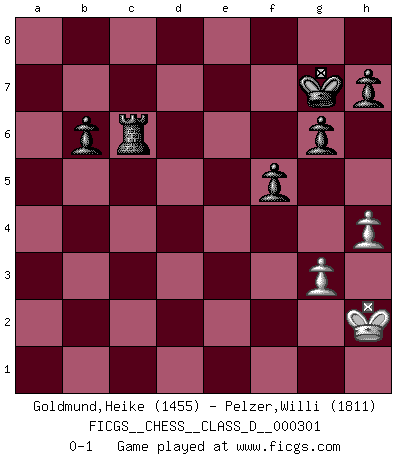 Last move : 0-1 2025 January 20 17:58:48 [Event "FICGS__CHESS__CLASS_D__000301"] [Site "FICGS"] [Date "2024.09.08"] [Round "1"] [White "Goldmund,Heike"] [Black "Pelzer,Willi"] [Result "0-1"] [WhiteElo "1455"] [BlackElo "1811"] 1.b4 Nf6 2.Bb2 g6 3.e3 Bg7 4.c4 d6 5.Nf3 O-O 6.d3 Nbd7 7.Be2 e5 8.O-O Re8 9.Nbd2 b6 10.Qc2 Bb7 11.Rfe1 Qe7 12.a3 e4 13.Nxe4 Nxe4 14.dxe4 Bxb2 15.Qxb2 Qxe4 16.Bf1 Rad8 17.Ng5 Qg4 18.Nf3 Bxf3 19.h3 Qg5 20.Rad1 Bxd1 21.Rxd1 Qe5 22.Qc2 Nf6 23.Be2 d5 24.cxd5 Rxd5 25.Rc1 Re7 26.Bc4 Rd6 27.Ba6 Red7 28.Bf1 Rd2 29.Qb3 Rb2 30.Qa4 R7d2 31.Qxa7 Rbc2 32.Qa8+ Kg7 33.Rxc2 Rxc2 34.Qf3 Qf5 35.Qd1 Qxf2+ 36.Kh2 Rd2 37.Qc1 Qxe3 38.Qxc7 Nh5 39.Bc4 Qf4+ 40.Qxf4 Nxf4 41.Bf1 Ra2 42.Kg3 Nh5+ 43.Kh2 Rxa3 44.b5 Rc3 45.Be2 Nf4 46.Bf3 f5 47.Bc6 Ne6 48.Bd7 Nd4 49.h4 Rc7 50.Be8 Re7 51.Bc6 Nxc6 52.bxc6 Rc7 53.g3 Rxc6 0-1 Follow this game move after move (download)Chess is above all, a fight ! (Emanuel Lasker) Dieses schreckliche Gefühl, dass ich gegen eine Maschine spielte, die niemals Fehler macht, zerschmetterte meinen Widerstand. (Mark Taimanov) Fischer era un maestro de claridad y un Rey del posicionamiento astuto. Sus oponentes podían ver hacia donde se dirigía pero eran impotentes para detenerlo. (Bruce Pandolfini) Le thème de l'attaque double intervient d'une manière ou d'une autre dans l'immense majorité des combinaisons. (Youri Averbakh) Experience is the name we all give to our mistakes. (Oscar Wilde)