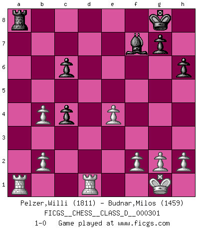 Last move : 1-0 2024 September 25 7:27:59 [Event "FICGS__CHESS__CLASS_D__000301"] [Site "FICGS"] [Date "2024.09.08"] [Round "1"] [White "Pelzer,Willi"] [Black "Budnar,Milos"] [Result "1-0"] [WhiteElo "1811"] [BlackElo "1459"] 1.e4 e5 2.d4 Bd6 3.Bc4 Nf6 4.Nf3 Bb4+ 5.c3 Ba5 6.Ng5 O-O 7.dxe5 h6 8.exf6 Qxf6 9.Nxf7 Rxf7 10.Bxf7+ Qxf7 11.Qb3 Qxb3 12.axb3 Bb6 13.O-O d6 14.Bf4 Be6 15.b4 Nd7 16.Nd2 c6 17.Bxd6 a6 18.c4 Bd4 19.Rab1 b5 20.Rfc1 a5 21.Nb3 Be5 22.Bxe5 Nxe5 23.Nxa5 Nxc4 24.Nxc4 bxc4 25.Rd1 Bf7 26.Ra1 1-0 Follow this game move after move (download)Chess is a sea in which a gnat may drink and an elephant may bathe. (Hindu proverb) Alles was ich jemals tun will ist Schach spielen. (Robert James Fischer) No existe un remordimiento como el remordimiento del Ajedrez. (H. G. Wells) La solitude du joueur d'Echecs à l'approche du mat est semblable à celle du condamné. (Francis Szpiner) A mistake is only a mistake if you let it happen twice. Otherwise it is a learning experience. (Daniel Parmet)