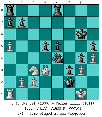 Last move : 0-1 2024 October 29 18:21:16 [Event "FICGS__CHESS__CLASS_D__000301"] [Site "FICGS"] [Date "2024.09.08"] [Round "1"] [White "Pintor,Manuel"] [Black "Pelzer,Willi"] [Result "0-1"] [WhiteElo "1800"] [BlackElo "1811"] 1.e4 e5 2.f4 d6 3.Nf3 exf4 4.Bc4 Be6 5.Bxe6 fxe6 6.O-O e5 7.d4 Nd7 8.Nc3 Ngf6 9.d5 Nc5 10.Ng5 h6 11.Ne6 Nxe6 12.dxe6 c6 13.g3 g5 14.Qf3 g4 15.Qd3 f3 16.h3 h5 17.h4 Qe7 18.Qc4 Bg7 19.Bg5 O-O 20.a4 Rfe8 21.Qb3 Kh7 22.a5 Kg6 23.Rf2 Bh6 24.Bxh6 Kxh6 25.Qc4 Qxe6 26.Qb4 d5 27.exd5 cxd5 28.Nb5 Qe7 29.Qc3 Ne4 30.Qe3+ Kg6 31.Qd3 Qc5 32.Nc3 Qxf2+ 0-1 Follow this game move after move (download)Kasparov : J'adoube , Ivanchuk : S'il vous plaît ! (Garry Kasparov & Vassily Ivanchuk, Linares 1997) Die Jungen erwarten, dass Opa einfach umfällt. Dann aber kann Opa fünf Stunden lang Schach spielen und die jungen Gegner an die Wand drücken. (Viktor Kortschnoi) Un mal plan es mejor que no tener ningún plan. (Frank Marshall) Ce qui est bien, c'est d'avoir tout un tas de pièces en prise : l'adversaire ne peut en prendre qu'une à la fois. Cité par Thierry Audin. But they are useless. They can only give you answers. (Pablo Picasso, about computers)