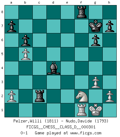 Last move : 0-1 2024 October 14 9:57:6 [Event "FICGS__CHESS__CLASS_D__000301"] [Site "FICGS"] [Date "2024.09.08"] [Round "1"] [White "Pelzer,Willi"] [Black "Nudo,Davide"] [Result "0-1"] [WhiteElo "1811"] [BlackElo "1793"] 1.e4 c5 2.g3 d5 3.Bg2 dxe4 4.Bxe4 g6 5.c3 Nc6 6.Ne2 Bg7 7.O-O e5 8.d3 Nge7 9.Be3 b6 10.b4 Bh3 11.Re1 cxb4 12.cxb4 Rc8 13.b5 f5 14.Bxc6+ Rxc6 15.Qb3 Rc7 16.Nbc3 Qa8 17.Ne4 fxe4 18.d4 exd4 19.Bxd4 e3 20.Nf4 Bxd4 21.Nxh3 exf2+ 22.Nxf2 Rf8 23.Rf1 Rc3 24.Qd1 Qe4 25.Qe1 Qxe1 26.Raxe1 Rc2 27.Rxe7+ Kxe7 28.Re1+ Kf6 29.Rf1 Kg7 0-1 Follow this game move after move (download)A bad plan is better than none at all. (Frank Marshall) Schach ist wie eine schöne Frau, zu der wir ständig zurückkehren, gleichviel, wie oft sie uns zurückweist. (Anonymous) La belleza de un movimiento no se refleja solo en su apariencia, sino en el pensamiento detrás de él. (Siegbert Tarrasch) C'est la seule position que je connaisse où les deux camps sont mals. Propos prêtés à V. Anand. Pushing plastic is for the many, pushing virtual pieces is for the fewer, pushing wood is for the very few. (Normajean Yates)