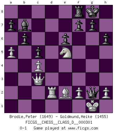 Last move : 0-1 2025 January 18 14:9:52 [Event "FICGS__CHESS__CLASS_D__000301"] [Site "FICGS"] [Date "2024.09.08"] [Round "1"] [White "Brodie,Peter"] [Black "Goldmund,Heike"] [Result "0-1"] [WhiteElo "1649"] [BlackElo "1455"] 1.c4 Nf6 2.Nc3 b6 3.e4 d6 4.Nf3 Bb7 5.d3 Nbd7 6.Be2 e6 7.O-O Be7 8.Bd2 Nc5 9.b4 Ncxe4 10.dxe4 O-O 11.a4 Nxe4 12.Nxe4 Bxe4 13.Bc3 Bb7 14.Qd4 Bf6 15.Qd3 Bxc3 16.Qxc3 c5 17.bxc5 dxc5 18.Rfd1 Qc7 19.Rd2 Rad8 20.Rad1 Rxd2 21.Rxd2 Qc6 22.a5 h6 23.Ne5 Qxg2+ 0-1 Follow this game move after move (download)The mistakes are there, waiting to be made. (Savielly Tartakower) Wenn du nicht weißt was du tun sollst, warte bis dein Gegner eine Idee hat. Sie wird sicher schlecht sein. (Siegbert Tarrasch) No hay precio que no valga la pena por la cabellera del Rey enemigo. (Koblentz) La tactique, c'est ce que vous faites quand il y a quelque chose à faire; la stratégie, c'est ce que vous faites quand il n'y a rien à faire. (Savielli Tartacower) A shortcut is the longest distance between two points. (Don Groves)