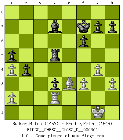 Last move : 1-0 2025 January 18 2:2:20 [Event "FICGS__CHESS__CLASS_D__000301"] [Site "FICGS"] [Date "2024.09.08"] [Round "1"] [White "Budnar,Milos"] [Black "Brodie,Peter"] [Result "1-0"] [WhiteElo "1459"] [BlackElo "1649"] 1.e4 c5 2.Nf3 Nc6 3.Bb5 Nf6 4.d3 Nd4 5.Nxd4 cxd4 6.O-O a6 7.Bc4 d5 8.exd5 Nxd5 9.Qf3 e6 10.Bxd5 exd5 11.Re1 Be7 12.Bg5 f6 13.Bh4 O-O 14.c4 dxc4 15.dxc4 Bc5 16.Qd5 Qxd5 17.cxd5 Bd7 18.h3 Rae8 19.Rxe8 Rxe8 20.Na3 Bxa3 21.bxa3 Re5 22.Rb1 b5 23.Bg3 Rxd5 24.Bf4 Bf5 25.Rd1 Kf7 26.Be3 d3 27.Rd2 a5 28.f3 b4 29.a4 Bd7 30.g4 1-0 This chess game has been lost on time (started : 2024.09.08 4:39:33) Follow this game move after move (download)I feel as if I were a piece in a game of Chess, when my opponent says of it: That piece cannot be moved. (Soren Kierkegaard) Wer nie einen Fehler gemacht hat, hat nie etwas Neues ausprobiert. (Albert Einstein) El Ajedrez es un juego de pelea el cual es puramente intelectual e incluye la suerte. (Richard Reti) Pour moi, les échecs ne sont pas un jeu mais un art. (Alexandre Alekhine) Wisdom begins at the end. (Daniel Webster)
