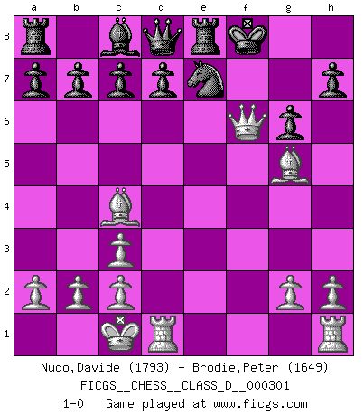 Last move : 1-0 2024 October 11 18:17:41 [Event "FICGS__CHESS__CLASS_D__000301"] [Site "FICGS"] [Date "2024.09.08"] [Round "1"] [White "Nudo,Davide"] [Black "Brodie,Peter"] [Result "1-0"] [WhiteElo "1793"] [BlackElo "1649"] 1.e4 e5 2.f4 exf4 3.Nf3 Nf6 4.e5 Nd5 5.Nc3 Nxc3 6.dxc3 Bc5 7.Bxf4 O-O 8.Qd3 Nc6 9.Ng5 g6 10.Qg3 Re8 11.O-O-O Be7 12.e6 Bxg5 13.exf7+ Kxf7 14.Bxg5 Ne7 15.Bc4+ Kg7 16.Qe5+ Kf8 17.Qf6+ 1-0 Follow this game move after move (download)It is always better to sacrifice your opponent's men. (Savielly Tartakower) Die Elozahlen sind sehr schlecht für das Schach. Jetzt ist Schach eine Sportindustrie, die darauf zielt Elopunkte zu machen. (Miguel Najdorf) Yo tuve un dolor de muelas en la primer partida. En el segundo juego, tuve un dolor de cabeza. En el tercero, tuve un ataque de reumatísmo. En la cuarta partida, no me sentía muy bien. ¿Y en el quinto juego? Bueno, ¿que acaso uno tiene que ganar todos los juegos?. (Siegbert Tarrasch) On n'a jamais que l'âge auquel on a commence à jouer aux échecs car après on cesse de vieillir. (Capablanca) Looking at the proliferation of personal web pages on the Net, it looks like very soon everyone on Earth will have 15 megabytes of fame. (M.G. Sriram)