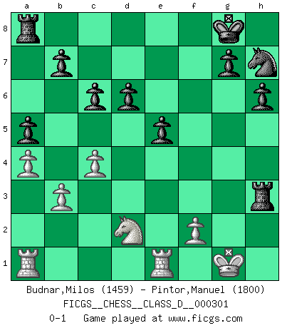 Last move : 0-1 2024 September 25 7:29:17 [Event "FICGS__CHESS__CLASS_D__000301"] [Site "FICGS"] [Date "2024.09.08"] [Round "1"] [White "Budnar,Milos"] [Black "Pintor,Manuel"] [Result "0-1"] [WhiteElo "1459"] [BlackElo "1800"] 1.e4 e5 2.Nf3 Nc6 3.Bb5 Bc5 4.O-O Nf6 5.d3 h6 6.Bxc6 dxc6 7.h3 Qd6 8.c4 a5 9.a4 O-O 10.Qe2 Nh7 11.b3 f5 12.exf5 Bxf5 13.Be3 Bxd3 14.Bxc5 Bxe2 15.Bxd6 cxd6 16.Re1 Bxf3 17.gxf3 Rxf3 18.Nd2 Rxh3 0-1 Follow this game move after move (download)A passed Pawn increases in strength as the number of pieces on the board diminishes. (Capablanca) Obwohl ich vom Stil her kaum zu den Priestern der Schachkunst gezählt werde, halte ich Schach doch für eine Kunst. (Tigran Petrosjan) Durante una competencia de Ajedrez, un Maestro de Ajedrez deberá ser una combinación de presa de caza y un Monge. (Alexander Alekhine) J'ai vu le vaincu d'Echecs jouer des années durant dans l'espoir de la fête de la victoire. Car tu es plus riche de ce qu'elle existe si même elle n'est point pour toi. Ainsi de la perle du fond des mers. (Antoine de Saint-Exupéry) If I had no sense of humor, I would long ago have committed suicide. (Mahatma Gandhi)