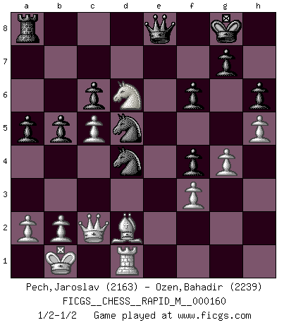 Last move : 1/2-1/2 2024 November 13 23:27:24 [Event "FICGS__CHESS__RAPID_M__000160"] [Site "FICGS"] [Date "2024.09.08"] [Round "1"] [White "Pech,Jaroslav"] [Black "Ozen,Bahadir"] [Result "1/2-1/2"] [WhiteElo "2163"] [BlackElo "2239"] 1.e4 c6 2.d4 d5 3.Nc3 dxe4 4.Nxe4 Bf5 5.Ng3 Bg6 6.h4 h6 7.Nf3 Nd7 8.h5 Bh7 9.Bd3 Bxd3 10.Qxd3 e6 11.Bf4 Qa5+ 12.Bd2 Bb4 13.c3 Be7 14.c4 Qc7 15.O-O-O Ngf6 16.Rhe1 b5 17.c5 O-O 18.Kb1 Rfd8 19.Qc2 a5 20.Nf5 exf5 21.Rxe7 Nd5 22.R7e1 f4 23.Rg1 Qc8 24.g4 f6 25.Nh4 Nf8 26.f3 Re8 27.Rge1 Ne6 28.Nf5 Qd7 29.Nd6 Nxd4 30.Rxe8+ Qxe8 1/2-1/2 Follow this game move after move (download)In Chess, as it is played by masters, chance is practically eliminated. (Emanuel Lasker) Privat ist Kortschnoi kein schlechter Mensch, sehr sympathisch. Aber während des Spiels ist er grausam. Er will dich töten. (Miguel Najdorf) Una victoria por una combinación errónea, aunque sea espectacular, me llena de horror artístico. (Wilhelm Steinitz) Aux échecs, l'amour-propre est satisfait quand on remporte la victoire, mais il n'y a pas de honte à être battu. (Benjamin Franklin) God is an atheist. (Unknown)