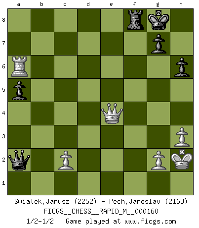 Last move : 1/2-1/2 2025 January 7 20:56:51 [Event "FICGS__CHESS__RAPID_M__000160"] [Site "FICGS"] [Date "2024.09.08"] [Round "1"] [White "Swiatek,Janusz"] [Black "Pech,Jaroslav"] [Result "1/2-1/2"] [WhiteElo "2252"] [BlackElo "2163"] 1.e4 e5 2.Nf3 Nc6 3.Bb5 Nf6 4.O-O Nxe4 5.Re1 Nd6 6.Nxe5 Be7 7.Bf1 Nxe5 8.Rxe5 O-O 9.d4 Bf6 10.Re1 Re8 11.Bf4 Rxe1 12.Qxe1 Ne8 13.Nc3 Bxd4 14.Nd5 d6 15.Bg5 f6 16.Bh4 Bxb2 17.Rb1 Be5 18.f4 c6 19.fxe5 cxd5 20.exf6 Nxf6 21.Bd3 Bd7 22.h3 b5 23.Bxb5 Bxb5 24.Rxb5 Qd7 25.Qb4 a6 26.Ra5 Qe6 27.Bxf6 Qxf6 28.Rxd5 Qa1+ 29.Kh2 Qxa2 30.Qe4 Rf8 31.Rxd6 a5 32.Rd7 h6 33.Ra7 Rf7 34.Ra6 Rf8 1/2-1/2 Follow this game move after move (download)Chess is played with the mind and not with the hands ! (Renaud and Kahn) Das Schachspiel ist ein See, in welchem eine Mücke baden und ein Elefant ertrinken kann. (Emanuel Lasker) Solo los afeminados hacen el Enroque. (Rob Sillars) Il n'y a pas eu de défaite parce que je ne crois pas que cet ordinateur ait jamais existé. IBM a triché en refusant d'imprimer les modes de recherche de la machine. C'est évident, pendant le match, des coups décisifs ont été joués par des êtres humains. Aujourd'hui, les meilleurs spécialistes en informatique ne peuvent toujours pas expliquer comment Deep-Blue a pu jouer contre la logique des ordinateurs. IBM a gagné une guerre de communication, mais ils sont incapables de prouver que l'ordinateur a gagné tout seul. (Garry Kasparov) The Movers & Shakers of this world are those who play chess in the mornings and go to the disco in the evenings. (Dinesh De Silva)