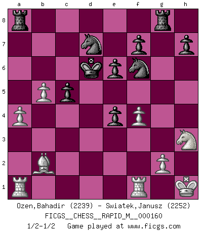 Last move : 1/2-1/2 2024 October 14 7:57:0 [Event "FICGS__CHESS__RAPID_M__000160"] [Site "FICGS"] [Date "2024.09.08"] [Round "1"] [White "Ozen,Bahadir"] [Black "Swiatek,Janusz"] [Result "1/2-1/2"] [WhiteElo "2239"] [BlackElo "2252"] 1.Nf3 c5 2.c3 Nf6 3.d4 d5 4.dxc5 e6 5.b4 a5 6.e3 axb4 7.cxb4 b6 8.Bb5+ Bd7 9.Bxd7+ Nbxd7 10.a4 bxc5 11.b5 Bd6 12.Bb2 Qc7 13.O-O g5 14.Nxg5 Bxh2+ 15.Kh1 Bd6 16.f4 Rg8 17.Nd2 Ke7 18.Nh3 Qb7 19.e4 dxe4 20.Nc4 Qd5 21.Nxd6 Qxd6 22.Qxd6+ Kxd6 1/2-1/2 Follow this game move after move (download)There is only one thing Fischer does in Chess without pleasure: to lose ! (Boris Spassky) Ich habe Putins Aufstieg an die Macht beobachtet und seine Politik, die demokratischen Institutionen meines Landes zu zerstören. (Garry Kasparov) Mi estilo es algo parecido entre un poco de Tal y Petrosian. (Reshevsky) Celui qui prend des risques peut perdre, celui qui n'en prend pas perd toujours. (Xavier Tartacover) A proverb is a short sentence based on long experience. (Miguel de Cervantes)