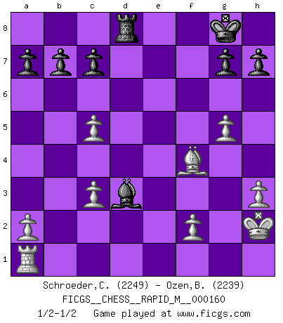 Last move : 1/2-1/2 2024 September 22 14:49:9 [Event "FICGS__CHESS__RAPID_M__000160"] [Site "FICGS"] [Date "2024.09.08"] [Round "1"] [White "Schroeder,Christoph"] [Black "Ozen,Bahadir"] [Result "1/2-1/2"] [WhiteElo "2249"] [BlackElo "2239"] 1.e4 e5 2.Nf3 Nf6 3.Nc3 Nc6 4.g3 d5 5.exd5 Nxd5 6.Bg2 Nxc3 7.bxc3 Bc5 8.O-O O-O 9.Re1 Bg4 10.h3 Bh5 11.g4 Bg6 12.Nxe5 Nxe5 13.d4 f5 14.g5 f4 15.dxc5 Qxd1 16.Rxd1 Rae8 17.Kh2 Bxc2 18.Rd4 Nd3 19.Bf1 Rd8 20.Bxd3 Bxd3 21.Rxd8 Rxd8 22.Bxf4 1/2-1/2 Follow this game move after move (download)I believe that Chess possesses a magic that is also a help in advanced age. A rheumatic knee is forgotten during a game of Chess and other events can seem quite unimportant in comparison with a catastrophe on the chessboard. (Vlastimil Hort) Je mehr wir mit Computern analysieren, desto mehr glauben wir an Verteidigung. (Vladimir Kramnik) El muchacho (en ese entonces un niño de 12 años llamado Anatoly Karpov) no tiene ni idea de lo que es el Ajedrez y no hay futuro en absoluto para el en esta profesión. (Mikhail Botvinnik) 'L'échange des dames est un coup dur pour les deux adversaires...' Un journaliste lors d'une partie du match Spassky-Fischer Statistics can be made to prove anything - even the truth. (Author unknown)
