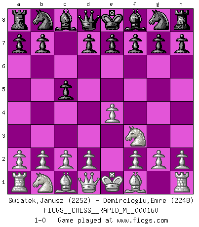 Last move : 1-0 2024 October 13 0:45:30 [Event "FICGS__CHESS__RAPID_M__000160"] [Site "FICGS"] [Date "2024.09.08"] [Round "1"] [White "Swiatek,Janusz"] [Black "Demircioglu,Emre"] [Result "1-0"] [WhiteElo "2252"] [BlackElo "2248"] 1.e4 c5 2.Nf3 1-0 This chess game has been lost on time (started : 2024.09.08 14:36:52) Follow this game move after move (download)Chess is as much a mystery as women. (Purdy) Der 70jährige Viktor Kortschnoi: Die Rentenanstalt wollte mich zwingen in Rente zu gehen. Meine Frau erhält jetzt eine Pension- und ich zahle weiter in die Rentenkasse ein! (Viktor Kortschnoi) En el Ajedrez, tal como es jugado por los Maestros, practicamente la suerte es eliminada. (Emanuel Lasker) Pour moi, les échecs ne sont pas un jeu mais un art. (Alexandre Alekhine) Wisdom is the reward you get for a lifetime of listening when you'd have preferred to talk. (Doug Larson)