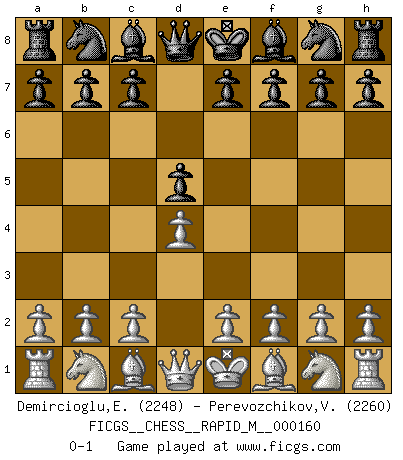 Last move : 0-1 2024 October 10 16:47:22 [Event "FICGS__CHESS__RAPID_M__000160"] [Site "FICGS"] [Date "2024.09.08"] [Round "1"] [White "Demircioglu,Emre"] [Black "Perevozchikov,Vjacheslav"] [Result "0-1"] [WhiteElo "2248"] [BlackElo "2260"] 1.d4 d5 0-1 This chess game has been lost on time (started : 2024.09.08 14:36:52) Follow this game move after move (download)Chess is so inspiring that I do not believe a good player is capable of having an evil thought during the game. (Wilhelm Steinitz) Kombinieren und Schwarzhandel gehören verboten. (Savielly Grigorievitsch Tartakower) Una compensación adecuada por un sacrificio es tener una combinación sólida que conduce a una posición ganadora; una compensación adecuada por una metida de pata es dejar a tu oponente arrebatar una derrota de las fauces de la victoria. (Bruce A. Moon) Si rien de grave n'est détecté lors de l'analyse d'une position, on joue alors le coup. Seconde règle de Blumenfeld. If you work for a living, why do you kill yourself working ? (Tuco to a chicken in The Good, The Bad and The Ugly)