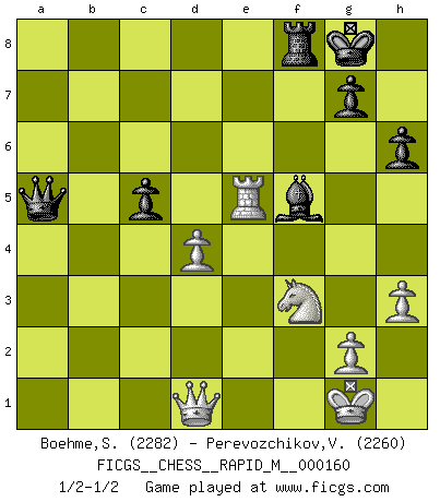 Last move : 1/2-1/2 2024 October 12 14:24:40 [Event "FICGS__CHESS__RAPID_M__000160"] [Site "FICGS"] [Date "2024.09.08"] [Round "1"] [White "Boehme,Sebastian"] [Black "Perevozchikov,Vjacheslav"] [Result "1/2-1/2"] [WhiteElo "2282"] [BlackElo "2260"] 1.e4 Nc6 2.Nf3 e5 3.Bc4 Nf6 4.d3 Bc5 5.c3 d6 6.O-O O-O 7.Re1 h6 8.h3 a5 9.Nbd2 Be6 10.Bb5 Bb6 11.Nc4 Bc5 12.Ne3 Bb6 13.Nc4 Ba7 14.Bxc6 bxc6 15.Nxa5 Bxf2+ 16.Kxf2 Rxa5 17.a4 Nd7 18.Kg1 f5 19.exf5 Bxf5 20.b4 Ra8 21.a5 c5 22.Be3 cxb4 23.cxb4 c5 24.bxc5 Nxc5 25.Bxc5 dxc5 26.Rxe5 Rxa5 27.Rxa5 Qxa5 28.d4 1/2-1/2 Follow this game move after move (download)When you are lonely, when you feel yourself an alien in the world, play Chess. This will raise your spirits and be your counselor in war. (Aristotle) Dein Körper muss in Topform sein. Dein Schach verfällt, wenn dein Körper verfällt. Der Körper kann nicht vom Geist getrennt werden. (Robert James Fischer) El arma más poderosa en el Ajedrez, es tener la próxima movida. (David Bronstein) Plusieurs personnes se sont demandées comment Tal faisait pour gagner... En fait, c'est très simple ! Il met ses pièces au centre de l'échiquier et les sacrifie quelque part ! (David Bronstein) If we knew what we were doing, we would not call it research. (Albert Einstein)