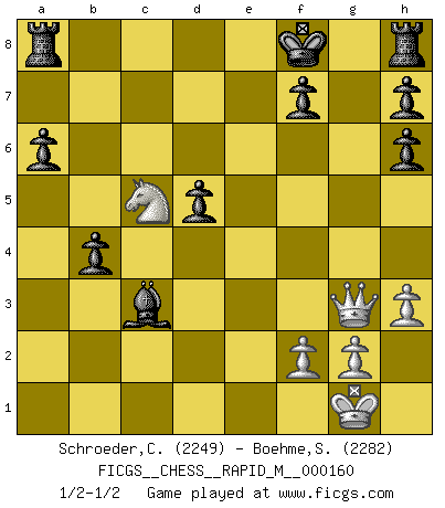 Last move : 1/2-1/2 2024 October 18 0:35:26 [Event "FICGS__CHESS__RAPID_M__000160"] [Site "FICGS"] [Date "2024.09.08"] [Round "1"] [White "Schroeder,Christoph"] [Black "Boehme,Sebastian"] [Result "1/2-1/2"] [WhiteElo "2249"] [BlackElo "2282"] 1.e4 c5 2.c3 e6 3.d4 d5 4.e5 Nc6 5.Nf3 Qb6 6.Be2 cxd4 7.cxd4 Nh6 8.Bxh6 Qxb2 9.Nbd2 gxh6 10.O-O Nxd4 11.Rb1 Nxe2+ 12.Qxe2 Qa3 13.Nd4 a6 14.Rfc1 Qxa2 15.h3 Bg7 16.Ra1 Qb2 17.Qg4 Bxe5 18.N2b3 Bd7 19.Rc2 Bxd4 20.Rxb2 Bxb2 21.Rb1 Bc3 22.Nc5 b5 23.Rd1 b4 24.Rxd5 exd5 25.Qxd7+ Kf8 26.Qd6+ Kg7 27.Qg3+ Kf8 1/2-1/2 Follow this game move after move (download)Chess is really ninety nine percent calculation. (Soltis) Jeder leidlich begabte Spieler, er braucht keineswegs hervorragend veranlagt zu sein, kann es zum Meister bringen. Aber das ist ja auch gar nicht nötig! Der richtige Standpunkt ist es, zu seinem Vergnügen zu spielen, und man glaube ja nicht, dass der Genuss proportional dem Können sei. (Siegbert Tarrasch) Un buen sacrificio es aquel que aunque no sea necesariamente sólido, deja a tu oponente aturdido y confuso. (Rudolph Spielmann) Même si vous avez un bon coup à faire, regardez toujours s'il n'y en a pas un qui lui soit préférable. (Pedro Damiano) My poor ole parrot... Is not in the circulation of displays ....poo hoo hoo :) (Wayne Lowrance's enigma)