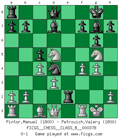 Last move : 0-1 2024 October 20 21:50:37 [Event "FICGS__CHESS__CLASS_B__000378"] [Site "FICGS"] [Date "2024.09.08"] [Round "1"] [White "Pintor,Manuel"] [Black "Petrovich,Valery"] [Result "0-1"] [WhiteElo "1800"] [BlackElo "1800"] 1.e4 c5 2.f4 d5 3.exd5 Nf6 4.c4 e6 5.dxe6 Bxe6 6.Nf3 Nc6 7.Nc3 g6 8.d3 Bg7 9.Be2 O-O 10.O-O Re8 11.Ng5 Bf5 12.g4 Bd7 13.Bf3 Nd4 14.Bd5 Nxd5 15.Nxd5 Re2 0-1 Follow this game move after move (download)A chess genius has died; a loss for humanity. (Viktor Kortchnoi, about Bobby Fischer's death) Ich war zu klein für die Schach-Schülermannschaft! (Woody Allen) No soy una persona materialista y por eso, no resiento la falta o pérdida del dinero. La ausencia de cosas mundanas carece de importancia. Ya que el Ajedrez es una forma en la que puedo ser tan materialista como yo desee sin tener la necesidad de vender mi alma. (Jamie Walter Adams) La guerre est enfant de la passion, la passion est enfant du narcissisme et le narcissisme est l'enfant. (...) Une autre partie ? (Thibault de Vassal) The various flowers seem good to different people. (Chinese proverb)