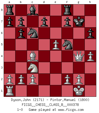 Last move : 1-0 2024 September 30 2:21:30 [Event "FICGS__CHESS__CLASS_B__000378"] [Site "FICGS"] [Date "2024.09.08"] [Round "1"] [White "Dyson,John"] [Black "Pintor,Manuel"] [Result "1-0"] [WhiteElo "2171"] [BlackElo "1800"] 1.e4 e5 2.Nf3 Nc6 3.Bc4 h6 4.d4 exd4 5.Nxd4 Qf6 6.Nb5 Bc5 7.O-O Bb6 8.N1c3 Nge7 9.Be3 O-O 10.Bxb6 cxb6 11.Nd6 Nd4 12.e5 Qf4 13.Re1 Ndc6 14.Re4 Qg5 15.h4 Qg6 16.Rg4 Qf5 17.Rxg7+ Kxg7 18.Nxf5+ Nxf5 19.Qg4+ 1-0 Follow this game move after move (download)If cunning alone were needed to excel, women would be the best Chess players. (Albin) Ohne Fehler kann es keine Brillanz geben. (Emanuel Lasker) El muchacho (en ese entonces un niño de 12 años llamado Anatoly Karpov) no tiene ni idea de lo que es el Ajedrez y no hay futuro en absoluto para el en esta profesión. (Mikhail Botvinnik) Les réformistes prétendent que les progrès de la théorie conduiront à la disparition des échecs, et qu'il faut, pour leur rendre vie, en remanier les règles. En réalité, qu'exprime cette affirmation? Le mépris de l'intuition, de l'imagination et de tous les autres éléments qui font des échecs un art. (Alexander Alekhine) There is a great deal of difference between an eager man who wants to read a book and a tired man who wants a book to read. (G.K. Chesterton)